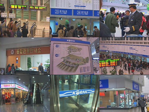 新しい駅舎は現在3Fがセマウル號改札、2Fが無窮花、統一號改札(*当時)となっています。改札を抜けて1Fがプラットホームの言わば「橋上駅舎」です。3Fは大きな吹き抜けのような構造で2Fの様子が良く見えます(中段右)